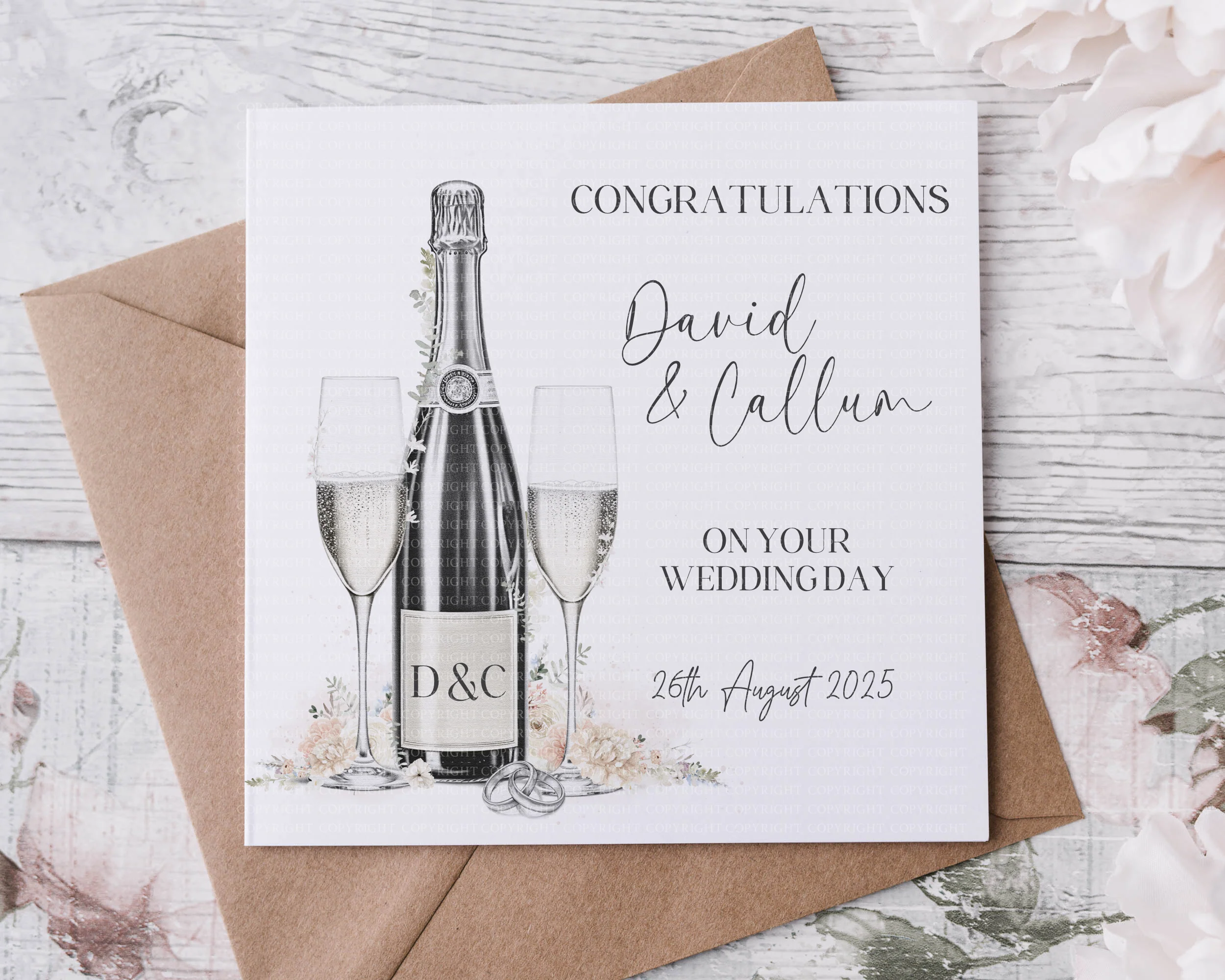 Celebrate love in style with this beautifully handcrafted 6" x 6" hammered card, designed to mark a couple’s special day with charm and elegance. Featuring original hand-drawn artwork, this card showcases a romantic champagne bottle and glasses, adorned with delicate peach floral accents – the perfect symbol of celebration and togetherness.