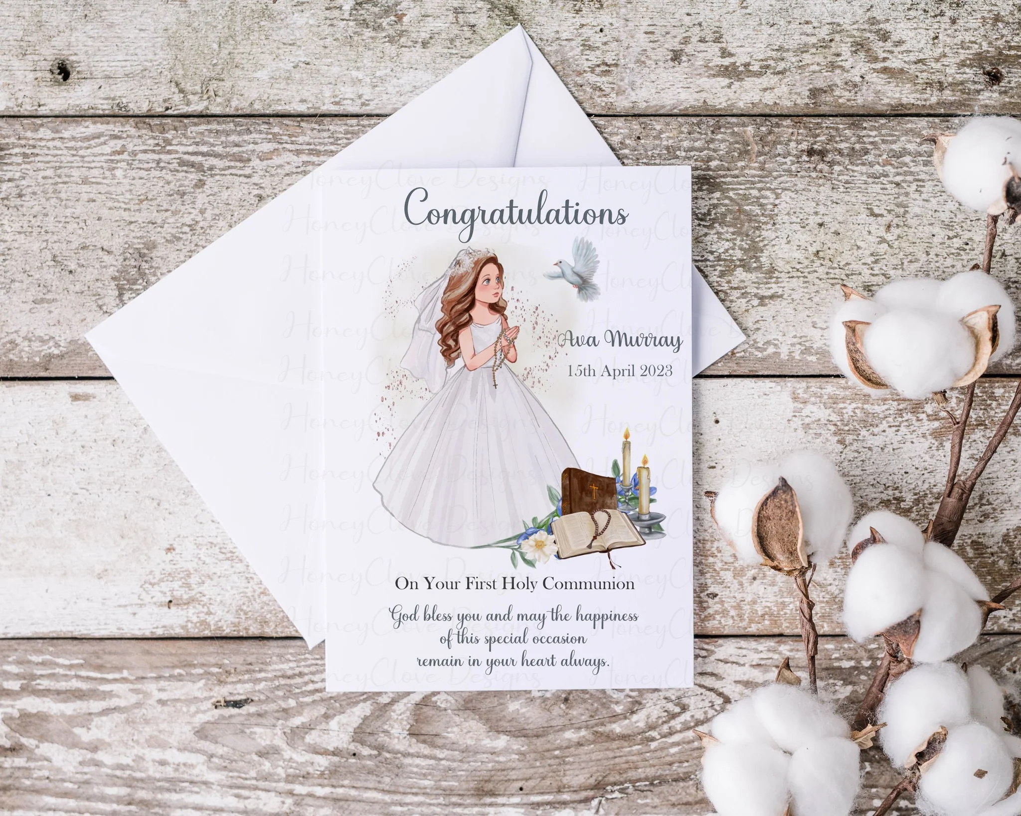 Gorgeous new communion girl design on a 5x7" size linen card. Personalised to suit. Please specify exactly what you would like on the front of the card, in the personalisation box.