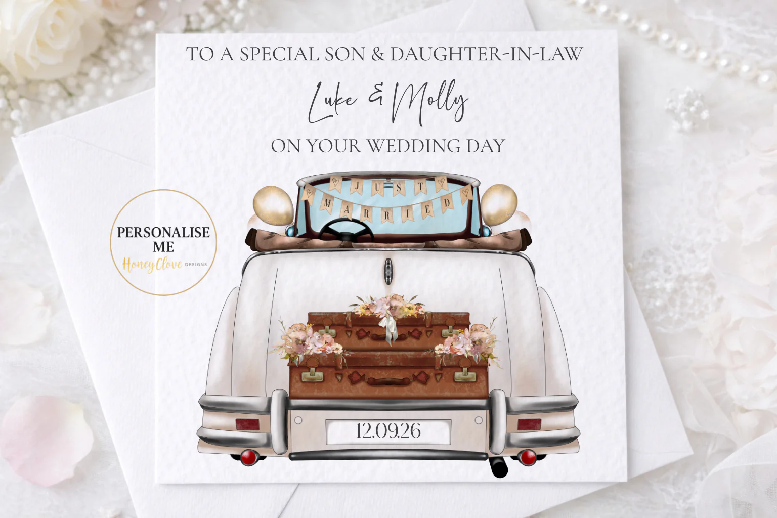 This luxury personalised wedding card features a timeless vintage “Just Married” car adorned with soft florals and delicate bunting, personalised with the couple’s names and wedding date. Elegant, romantic and beautifully understated, it makes a meaningful keepsake for such a special milestone.